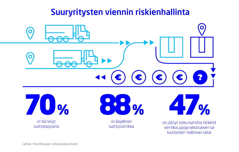 Seventy per cent of large corporates have suffered credit losses in export. In addition to the losses, half of the large export companies have lost important deals, despite the fact that they are fairly familiar with risk management and export financing work. This is indicated by the export financing barometer commissioned by Finnvera, Finland Chamber of Commerce and the International Chamber of Commerce, published in the summer.