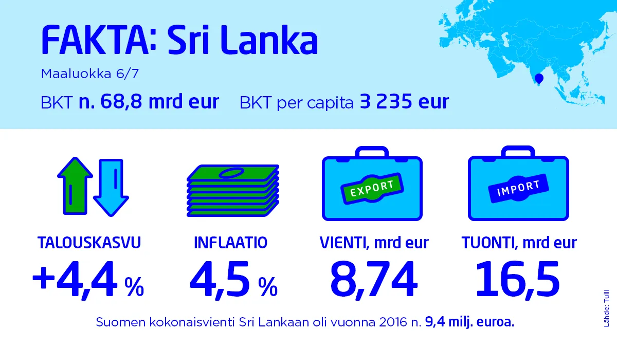 Sri Lanka’s vast investments and important location have not yet drawn the attention of many Finnish enterprises. Statistics by the Customs Finland reveal that the total value of goods exports to Sri Lanka were just EUR 9.4 million in 2016, and even less in the first half of 2017.