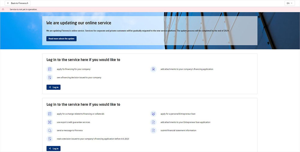 Finnvera’s online services will be updated between 2023 and 2024, when services will be gradually transferred to the new service platform. In the first phase of the update, on Monday 5 June, the front page of the online service for corporate and private customers and some of the services intended for corporate and private customers will be updated.