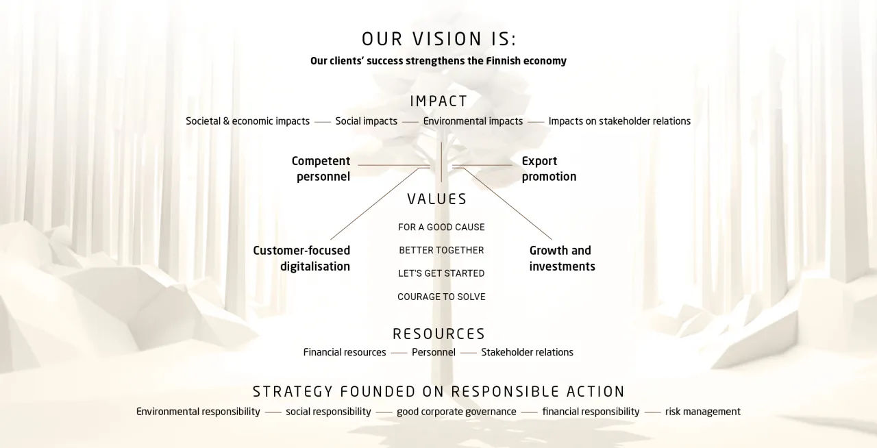 At Finnvera, sustainability has been integrated comprehensively into the company’s strategy and operations. Sustainability aspects are addressed in decision-making at all levels, and they guide the operations towards a sustainable future. Along with climate change mitigation, biodiversity will become another priority area of Finnvera's sustainability. Sustainability measuring and reporting was remarkably developed in 2024, and for the first time, Finnvera calculated it’s carbon handprint.