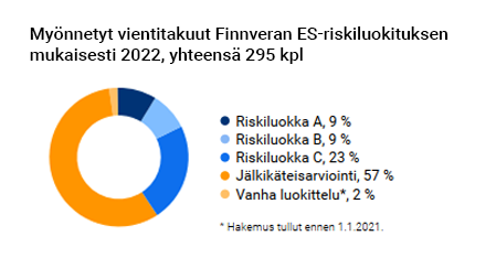 Finnveraan tuli vuonna 2022 yhteensä 371 (455) vientitakuuhakemusta. Näistä 47 prosenttia oli lyhyen maksuajan remburssi- ja pankkiriskitakuita, joiden ympäristö- ja sosiaaliset riskit arvioidaan jälkikäteen vuosittain. 15 prosenttia hakemuksista oli kulutus- ja raaka-ainetuotteisiin kohdistuvia takuita, joiden osapuolista ei riskihauissa löytynyt merkittäviä riskejä. Nämä takuut saivat suoraan vähäisten riskien luokan C. Loput 118 (32 %) lähinnä pääomatavaroihin kohdistuvaa hakemusta arvioitiin Finnveran ympäristö- ja sosiaalisten riskien asiantuntijoiden tiimissä. Niistä alustavan A-riskiluokan sai 36 prosenttia, B-riskiluokan 29 prosenttia ja C-riskiluokan 19 prosenttia. Vuonna 2022 myönnettiin 295 vientitakuuta, joista 98 prosenttia käsiteltiin uuden prosessin mukaisesti.