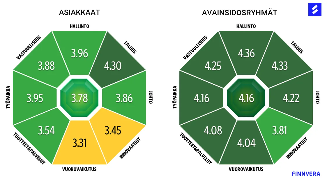Asiakkaiden antaman arvion keskiarvo on 3.78 ja avainsidosryhmien jopa 4.16, kun paras mahdollinen tulos on 5.00. Asiakkaista tyytyväisimpiä ovat suuryritykset, mutta myös pk-yritysten antamat arviot ovat korkealla. Vientiä tekevät asiakasyritykset antavat Finnveralle erinomaiset arviot. Myös kasvuyritykset ovat tyytyväisiä.