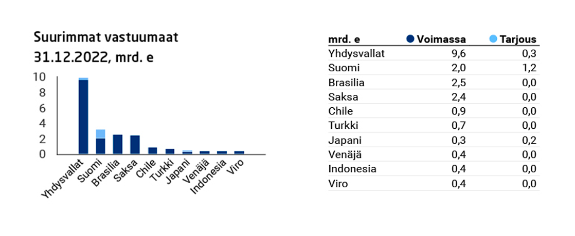 Finnveran vientitakuu- ja erityistakaustoiminnan suurimmat vastuumaat vuoden 2022 lopussa.