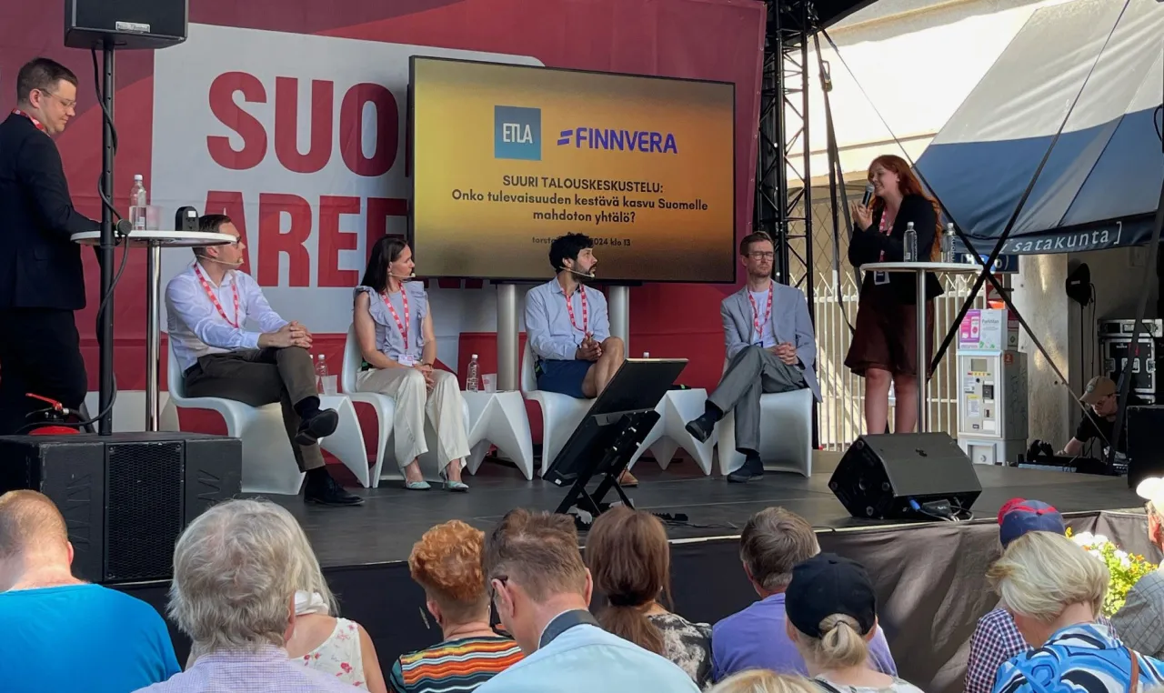 Onko tulevaisuuden kestävä kasvu mahdollinen yhtälö Suomelle? On, kun talouden pitkän aikavälin haasteisiin saadaan ratkaisuja ja työkaluja. Tällä hetkellä katse on liikaa lyhyen tähtäimen suhdanneluonteisissa kysymyksissä. Tulevaisuuden kestävän kasvun keinoista puhuttiin Etlan ja Finnveran talouskeskustelussa Porin SuomiAreenassa 27.6.2024. Lavalla olivat keskustelemassa sekä hallituspuolueen että opposition edustajat sekä huippuekonomistit. Vakiintuneita näkökulmia talouteen ravistelivat keskustelun haastajat ilmaston ja tekoälyn näkökulmista.