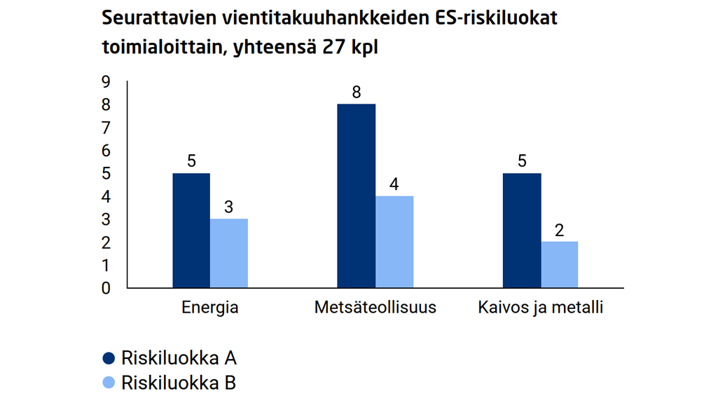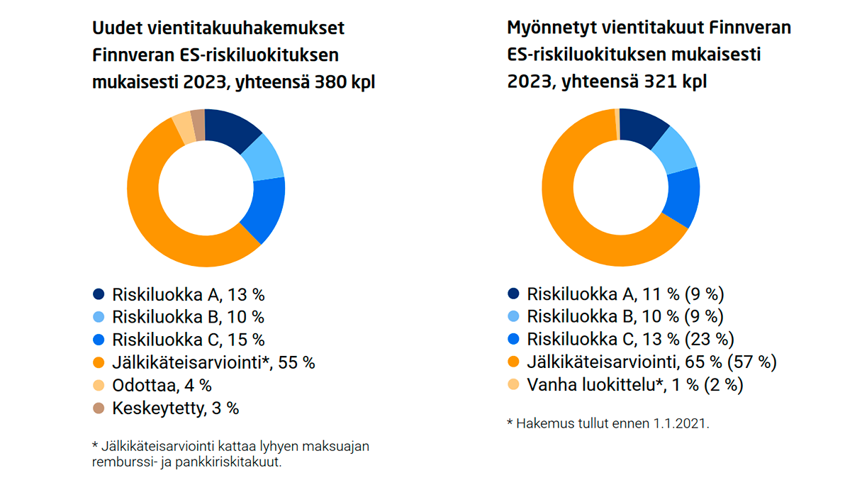 Eri aihealueiden osalta on määritelty indikaattorit, joiden perusteella vientitakuuhakemukselle annetaan Finnveran määritelmän mukainen riskiluokka (A/B/C). Finnveraan tuli vuonna 2023 yhteensä 380 (371) vientitakuuhakemusta. Suuria, korkean riskin hankkeita, joista edellytettiin laaja ympäristö- ja sosiaalisten riskien arviointi, oli vuonna 2023 tulleista vientitakuuhakemuksista 9 kappaletta eli 2 prosenttia. Keskusteluissa vientikaupan osapuolten kanssa käydään läpi hankkeen toteutumisen edellytykset. Tavoitteena on toimia ennakoivasti ja ohjaten, jotta hanke täyttäisi sille asetetut vaatimukset. Vuonna 2023 Finnvera ei hylännyt yhtään rahoitushakemusta ympäristö- ja sosiaalisten riskien vuoksi.
