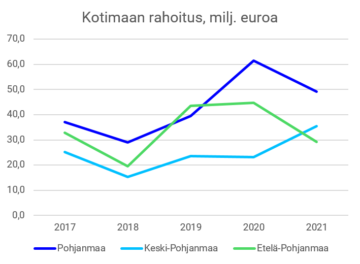 Finnvera myönsi Pohjanmaan, Etelä-Pohjanmaan ja Keski-Pohjanmaan maakuntiin kotimaan rahoitusta vuonna 2021 yhteensä 114 miljoonaa euroa (129). Rahoitus laski vuodesta 2020, jolloin Finnveran rahoituksessa näkyi erityisesti koronakriisin aiheuttama rahoitustarve. Myönnetyn rahoituksen määrä oli kuitenkin edelleen pandemiaa edeltänyttä aikaa korkeammalla. Suurin osa maakuntien rahoituksesta kohdistui kasvuhakuisille yrityksille. Etelä-Pohjanmaalla investointien rahoitus ei kasvanut odotetusti lupaavan alkuvuoden jälkeen. Pohjanmaalla investointirahoitus jatkui tasaisena, ja Keski-Pohjanmaalla rahoitus kasvoi loppuvuonna.