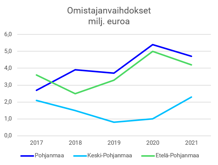 Pohjanmaalla ja Keski-Pohjanmaalla lähivuosina omistajanvaihdosta miettivien osuus kasvoi Pk-yritysbarometrin mukaan hieman, mikä ennakoi yrityskauppojen lisääntymistä lähitulevaisuudessa. Etelä-Pohjanmaalla omistajavaihdosta harkitsevien osuus oli laskussa. Omistajanvaihdokset ovat tärkeitä yrityskentän elinvoimaisuudelle. Finnvera oli vuonna 2021 rahoittamassa maakunnissa yhteensä 66 yrityksen (70) omistajanvaihdosta yhteensä 11 miljoonalla eurolla (11).
