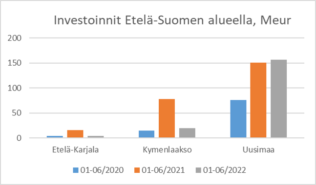 Kymenlaaksossa investointien määrä laski vuoden 2021 investointipiikin jälkeen. Vuoteen 2020 verrattuna investoinnit kasvoivat kuitenkin 28 prosenttia. Myös Etelä-Karjalassa investointien määrä väheni viime vuodesta, mutta kasvoi 15 prosenttia vuoteen 2020 verrattuna.