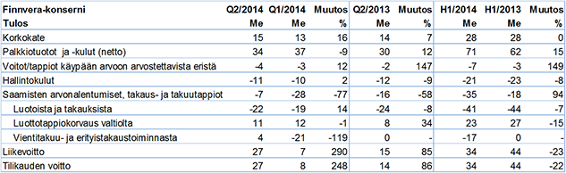 Finnvera-konsernin tammi–kesäkuun tulos oli 34 miljoonaa euroa voitollinen. Tulos oli 10 miljoonaa euroa edellisen vuoden vastaavan jakson tulosta heikompi (44). Tuloksen heikkenemiseen vaikuttivat merkittävimmin emoyhtiö Finnvera Oyj:n saamisten arvonalentumisten ja takaus- ja takuutappioiden kasvu sekä tappiot pääomasijoitustoiminnan käypään arvoon arvostettavista eristä. Tulosheikennystä vastaavasti pienensivät edellisvuoden vastaavaa jaksoa korkeammat palkkiotuotot sekä hallintokulujen lasku.