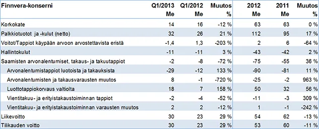 Finnveran ensimmäisen neljänneksen tulos oli selkeästi edellisen vuoden vastaavaa jaksoa parempi, mutta talouden epävarmuudesta ja Finnveran vastuukannan korkeasta riskitasosta johtuen vuoden 2013 tulos toteutunee kuitenkin edellisen vuoden tasoisena. Yksittäiset riskit voivat toteutuessaan heikentää tulosta tuntuvasti.