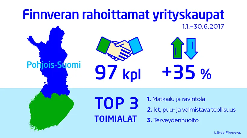 Yrityskauppojen määrä kasvoi edelleen alkuvuonna, vaikka jo viime vuosi oli poikkeuksellisen vilkas. Finnveran tammi-kesäkuun tilastojen perusteella veturin roolin on ottanut Pohjois-Suomi, jossa Finnveran rahoittamat yrityskaupat lisääntyivät peräti 35 prosenttia viime vuoden vastaavasta ajasta. Yrityskauppoja syntyy paljon muun muassa terveydenhuoltoalalla yritysten valmistautuessa sote-uudistukseen. Valtakunnallisesti omistajanvaihdoksia tehtiin kolme prosenttia enemmän kuin vastaavana aikana viime vuonna.