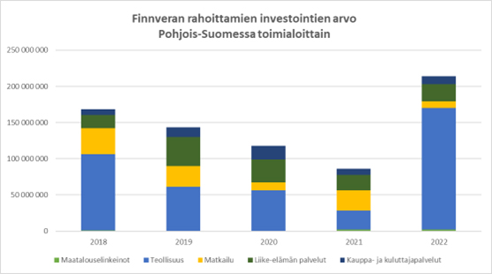 Vuonna 2022 Finnveran rahoitus pohjoissuomalaisille yrityksille kasvoi 16 prosenttia edellisvuodesta yhteensä 125 miljoonaan euroon. Vuotta värittivät Venäjän aloittaman hyökkäyssodan shokkivaikutukset talousympäristöön. Vaikutukset Finnveran rahoituksen kysyntään pysyivät kuitenkin maltillisina.