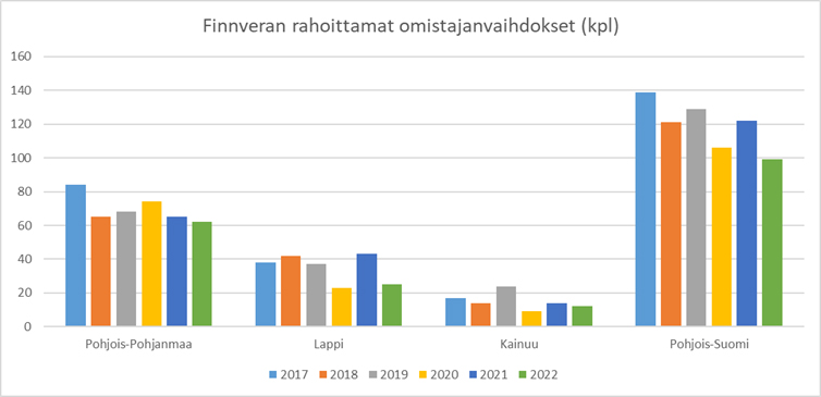 Pohjois-Suomessa rahoitettiin vuoden 2022 aikana yhteensä 99 yrityksen omistajanvaihdosta, mikä on 19 prosenttia vähemmän kuin edellisvuotena. Finnveran rahoittamien omistajanvaihdosten määrän osalta on nähtävissä laskutrendi. Tämä on huolestuttavaa tilanteessa, jossa yhä useampi yritys kaipaa omistajanvaihdosta yrittäjien saavuttaessa eläkeiän. Vuosi oli heikko erityisesti Lapissa, jossa omistajanvaihdosten määrä oli alhaisempi kuin koronavuonna 2020. Olisi toivottavaa, että yhä useampi aloittava yrittäjä näkisi omistajanvaihdoksen keinona aloittaa yritystoiminta.