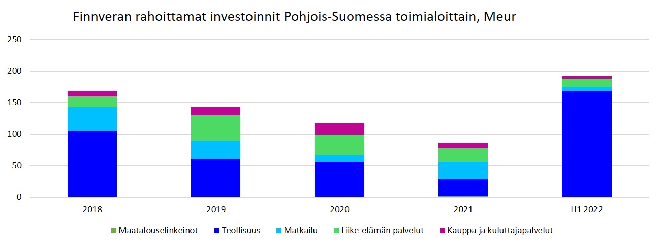 Pohjois-Pohjanmaalla rahoitus kasvoi edellisvuoteen nähden kaikilla päätoimialoilla paitsi matkailussa. Erityisesti teollisuuden investoinnit olivat reippaassa kasvussa puuhun perustuvassa valmistuksessa sekä metalliteollisuudessa. Finnveran rahoitus teollisuusyrityksille kasvoi 36 miljoonaan euroon edellisvuoden 17 miljoonasta eurosta. Tällä rahoituksella mahdollistettiin yhteensä 98 miljoonan euron investoinnit maakuntaan.