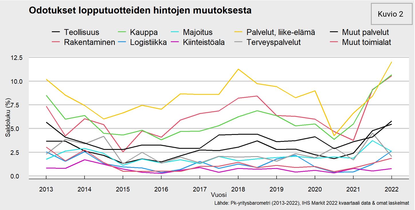 Odotukset hintojen muutoksesta vaihtelevat toimialoittain. Kaupan, palvelujen ja rakentamisen aloilla hintojen nousua odottaa huomattavasti useampi yritys, eli näillä toimialoilla yritykset arvioivat joutuvansa lähitulevaisuudessa kustannusten kattamiseksi nostamaan lopputuotteidensa hintoja, mikä tuntuu jatkossa enemmän esimerkiksi kuluttajien lompakossa.