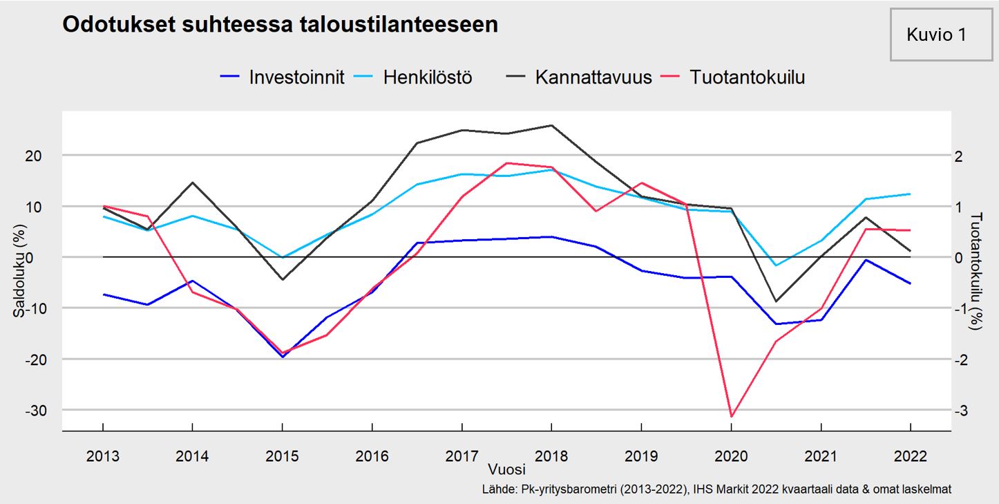 Kevään barometrissa valtaosa yrityksistä odotti investointien laskevan, mitä nyt nähty korkotason nousu jarruttaa entisestään. Huolestuttavaa on, että investointien taso oli Suomessa entuudestaan varsin alhainen finanssi- ja eurokriisien jäljiltä. Odotukset yritysten kannattavuudesta olivat 2022 alussa positiivisia, mutta nekin laskussa ja lähellä nollaa. Nousseet kustannukset puolestaan ajavat yrityksiä taloudellisesti ahtaalle.