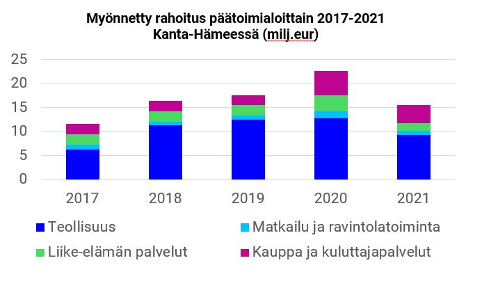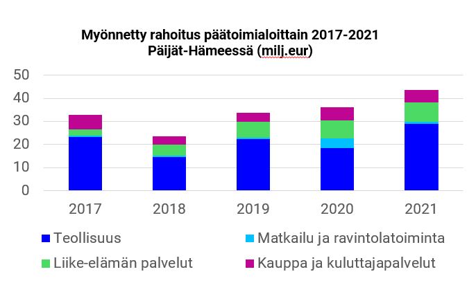Finnveran myöntämästä kokonaisrahoituksesta yhteensä 66 prosenttia kohdistui maakunnassa teollisille toimialoille. Päijät-Hämeen matkailu- ja ravintola-ala selvisi viime vuonna ilman merkittävää Finnveran lisärahoitusta. Toimialalle myönnettiin vuonna 2021 rahoitusta ainoastaan miljoona euroa (4).