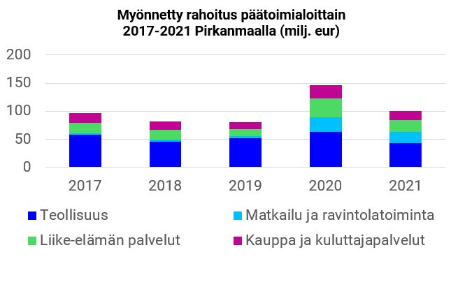 Finnvera myönsi vuonna 2021 rahoitusta Pirkanmaan, Päijät-Hämeen ja Kanta-Hämeen maakuntiin yhteensä 159 miljoonaa euroa (205). Myönnetyn rahoituksen kokonaismäärän väheneminen johtui siitä, ettei alueen yrityksillä ollut enää koronasta aiheutuvia rahoitustarpeita samassa laajuudessa kuin pandemian alkuvaiheessa keväällä 2020. Viime vuonna myönnettiin rahoitusta kokonaisuutena kuitenkin hieman enemmän kuin vuonna 2019 (133 miljoonaa euroa).