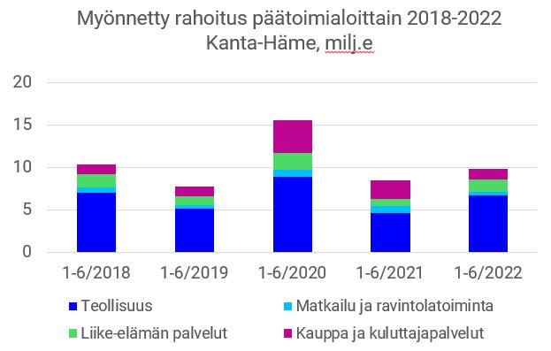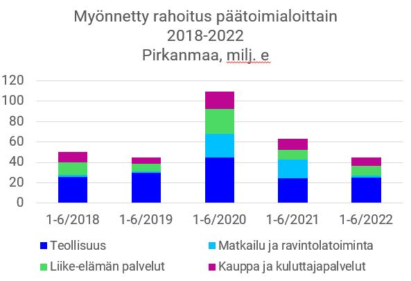 Alueen maakunnista Pirkanmaalle myönnettiin tammi‒kesäkuussa 2022 rahoitusta yhteensä 45 miljoonaa euroa (63), Päijät-Hämeeseen 31 miljoonaa euroa (26) ja Kanta-Hämeen yrityksille 10 miljoonaa euroa (9).