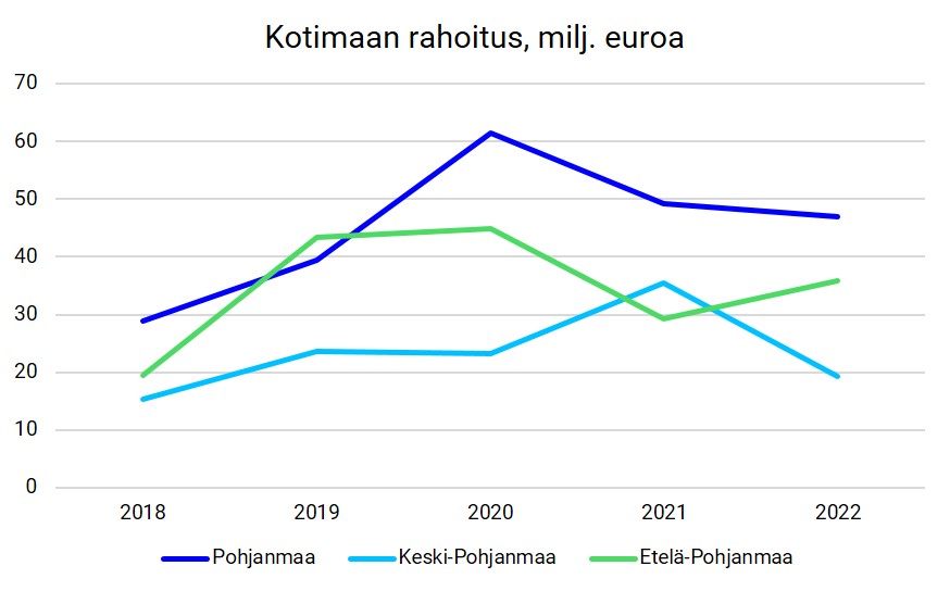 Finnvera myönsi Etelä-Pohjanmaan, Pohjanmaan ja Keski-Pohjanmaan alueen yrityksille kotimaan rahoitusta yhteensä 102 miljoonaa euroa (114) vuonna 2022. Tästä Pohjanmaan osuus oli 47 miljoonaa euroa (49), Etelä-Pohjanmaan 36 miljoonaa euroa (29) ja Keski-Pohjanmaan 19 miljoonaa euroa (35). Finnveran myöntämä rahoitus mahdollisti 214 miljoonan euron kokonaishankkeiden toteutumisen yhdessä pankkien ja muiden rahoittajien kanssa.