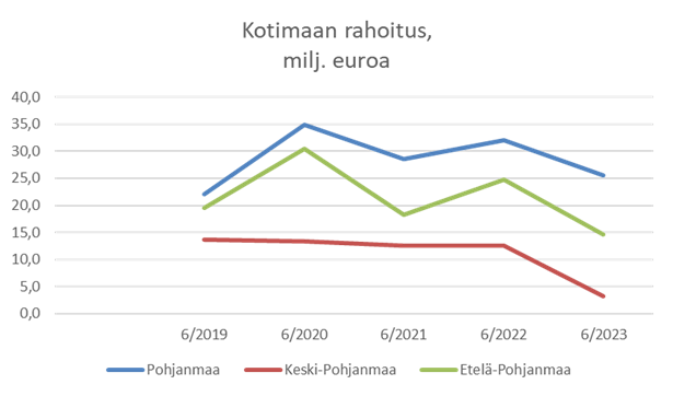 Pohjanmaan yrityksille myönnettiin tammi‒kesäkuussa kotimaan rahoitusta 26 miljoonaa euroa (32), Keski-Pohjanmaalle 3 miljoonaa euroa (13) ja Etelä-Pohjanmaalle 15 miljoonaa euroa (25).
