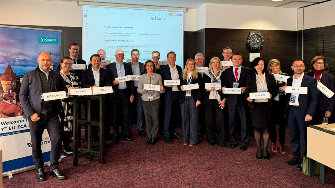 Vientitakuulaitosten aiesopimuksen allekirjoitukset täydentyivät Tallinnassa EU ECA Summit -kokouksessa 6.11.2024, jossa kaikkien 19 allekirjoittajan edustajat olivat paikalla. Finnveran liiketoimintajohtaja Jussi Haarasilta kuvassa keskellä.