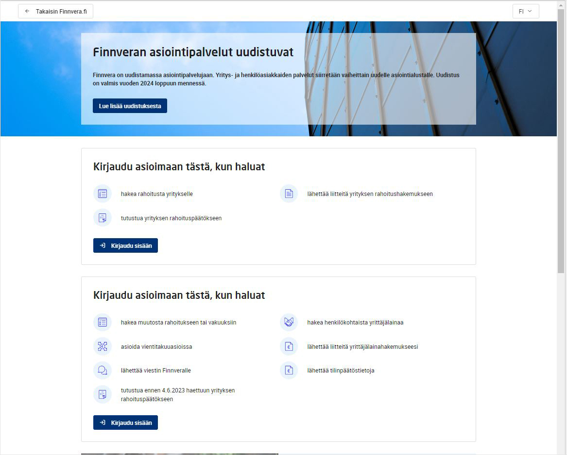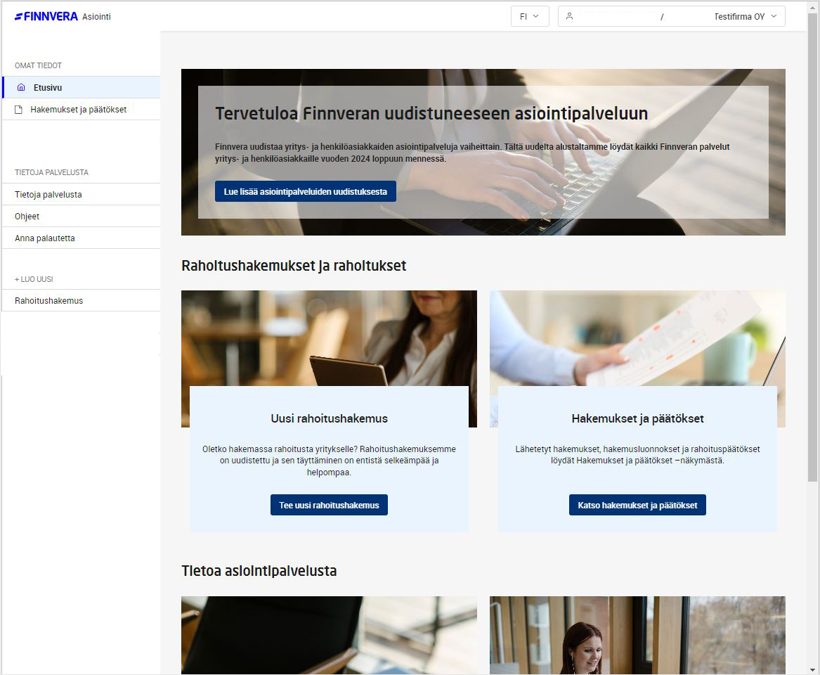Finnveran sähköiset asiointipalvelut uudistuvat vuosien 2023–2024 aikana, jolloin palveluita siirretään vaiheittain uudelle asiointialustalle. Uudistuksen ensimmäisessä vaiheessa, maanantaina 5.6., yritys- ja henkilöasiakkaiden asiointipalvelun etusivu ja osa palveluista uudistuu.
