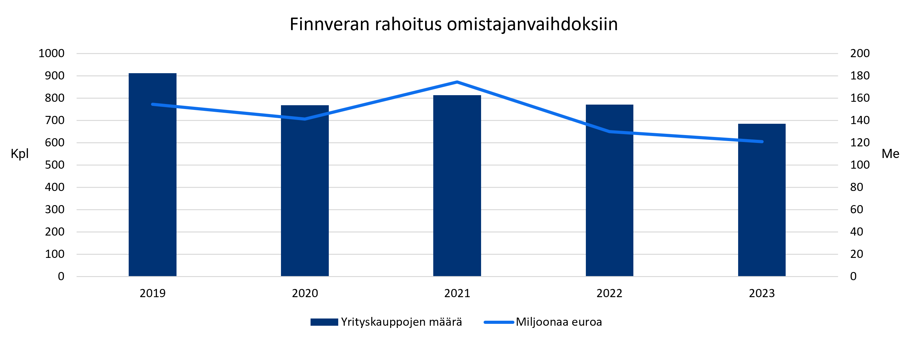 Finnveran myöntämän omistajanvaihdosten rahoituksen euro- ja kappalemäärät laskivat vuonna 2023. Rahoituksella mahdollistettiin 685 (771) yrityksen omistusjärjestely. Yrityskauppojen lukumäärä laski 11 prosenttia edelliseen vuoteen verrattuna.