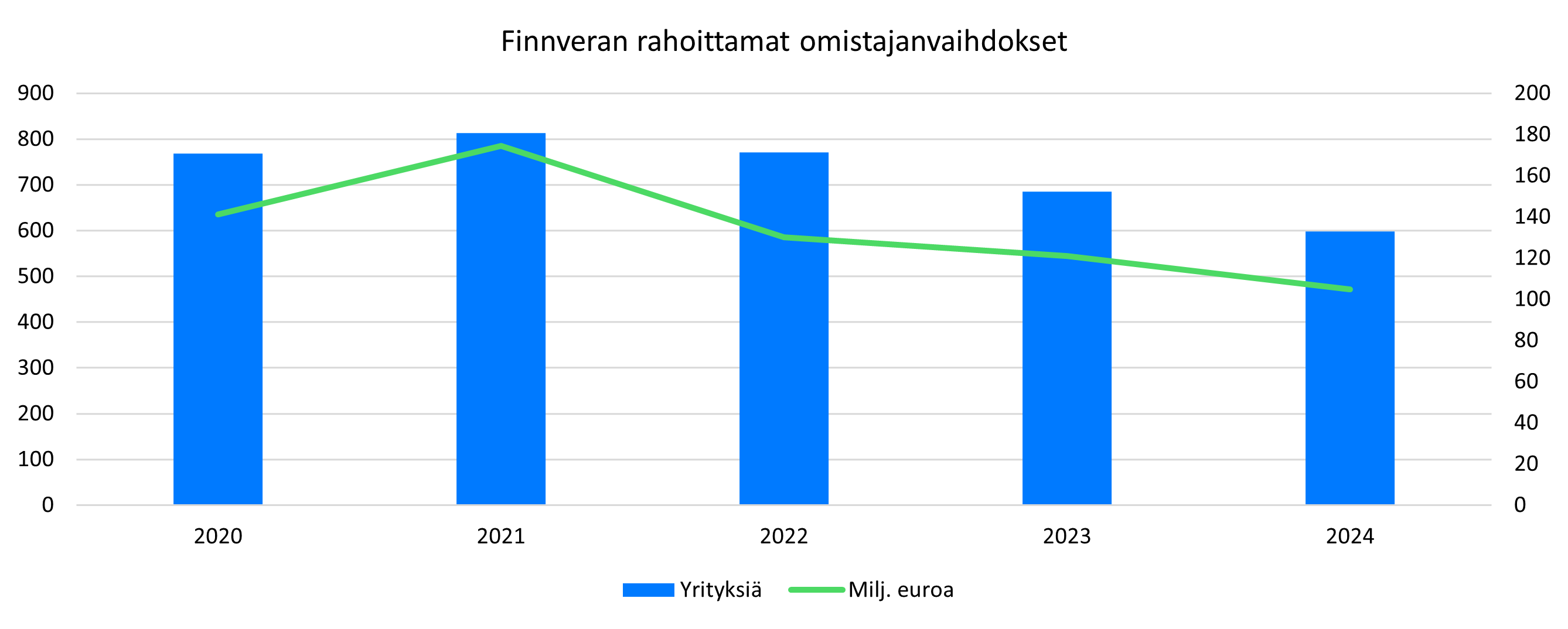 Finnveran myöntämän omistajanvaihdosten rahoituksen euro- ja kappalemäärät laskivat edelleen vuonna 2024. Rahoituksella mahdollistettiin 598 (685) yrityksen omistusjärjestely. Yrityskauppojen lukumäärä laski 13 prosenttia edelliseen vuoteen verrattuna.