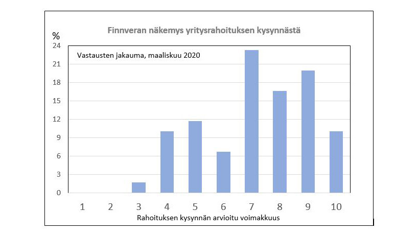 Finnvera kysyi eri puolilla Suomea pääosin pk-yritysten, mutta myös suuryritysten parissa työskenteleviltä rahoituspäälliköiltään, aluejohtajiltaan sekä luottopäätösyksiköltään näkemyksiä yritysrahoituksen tulevien 6 kuukauden näkymistä. Vastauksissa pyydettiin käsityksiä yritysrahoituksen koko kentästä, ei yksin Finnveran palveluista. Kysely osoitti, että jo noin 10 päivää sitten koronaviruksen aiheuttamat käyttöpääomatarpeet olivat erittäin hurjassa kasvussa. Joka viides vastaaja arvioi kysynnän voimakkuudeksi 9 ja lähes joka neljäs arvon 7. Vapaiden kommenttien sävy muuttui kyselyn aikana päivä päivältä synkemmäksi. Monissa avoimissa kommenteissa todettiin, että ”Koronaviruksen aiheuttamat käyttöpääomatarpeet kasvavat erittäin hurjaa vauhtia”.
