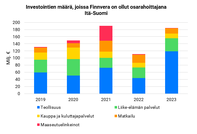 Haastavasta korko- ja toimintaympäristöstä huolimatta Itä-Suomen yritykset hyödynsivät vuonna 2023 Finnveran rahoitusta edellisvuotta enemmän. Finnvera myönsi rahoitusta neljän maakunnan alueelle, Pohjois-Savoon, Etelä-Savoon, Pohjois-Karjalaan ja Keski-Suomeen, yhteensä 156 miljoonaa euroa, ja rahoitus kasvoi 12 prosenttia edellisvuodesta. Keski-Suomessa, Pohjois-Karjalassa ja Pohjois-Savossa Finnveran myöntämä rahoitus kääntyi kahden laskuvuoden jälkeen kasvuun. Sen sijaan Etelä-Savossa rahoitus jatkoi laskuaan kolmatta vuotta peräkkäin. Itä-Suomen alueella rahoitus painottui teollisuuteen. Itä-Suomi kärsii tällä hetkellä Venäjän käynnistämän sodan seurauksista. Talouskasvun kääntämiseksi tuottavuutta parantavat investoinnit ja yrityskaupat olisi saatava kasvuun.