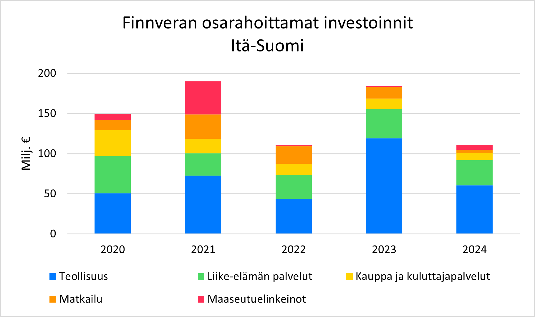 Vuonna 2024 Finnveran rahoitus mahdollisti yhteensä 111 miljoonan euron kokonaisinvestoinnit Itä-Suomen alueelle yhdessä muiden rahoittajien kanssa. Vuonna 2023 investointien arvo oli 185 miljoonaa euroa. Teollisuuteen rahoitettujen investointien määrä, yhteensä 61 miljoonaa euroa, lähes puolittui edellisvuoteen verrattuna (119).