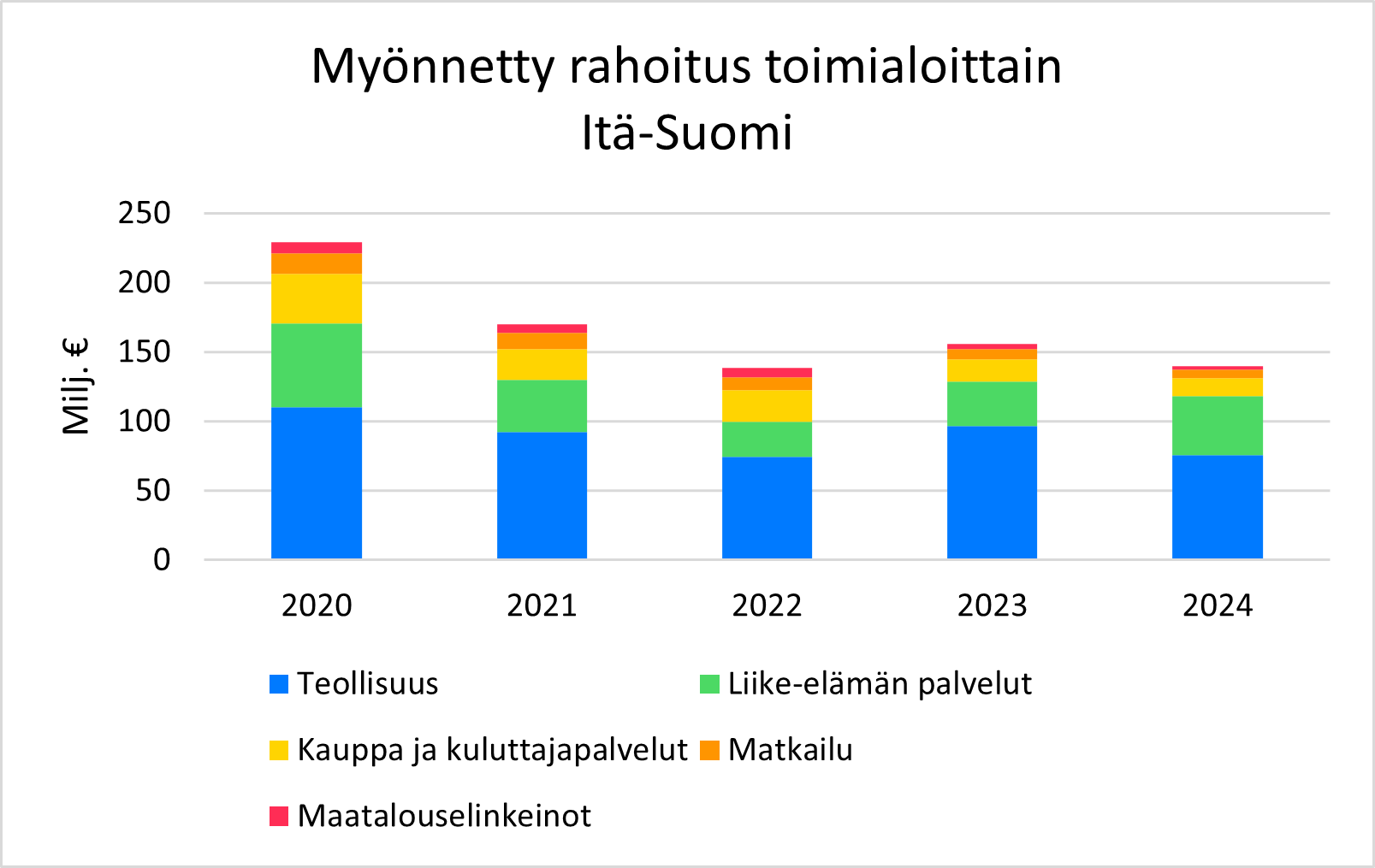 Finnveran myöntämän rahoituksen määrä laski teollisuudessa 21 miljoonaa euroa (-22 prosenttia). Liike-elämän palveluissa rahoitus sen sijaan kasvoi 34 prosenttia lähes 43 miljoonaan euroon. Muilla päätoimialoilla rahoituksen kysyntä hiljeni edellisvuodesta: kaupan ja kuluttajapalvelujen alalla laskua oli 18 prosenttia, matkailussa 17 prosenttia ja maaseutuelinkeinoissa 39 prosenttia.