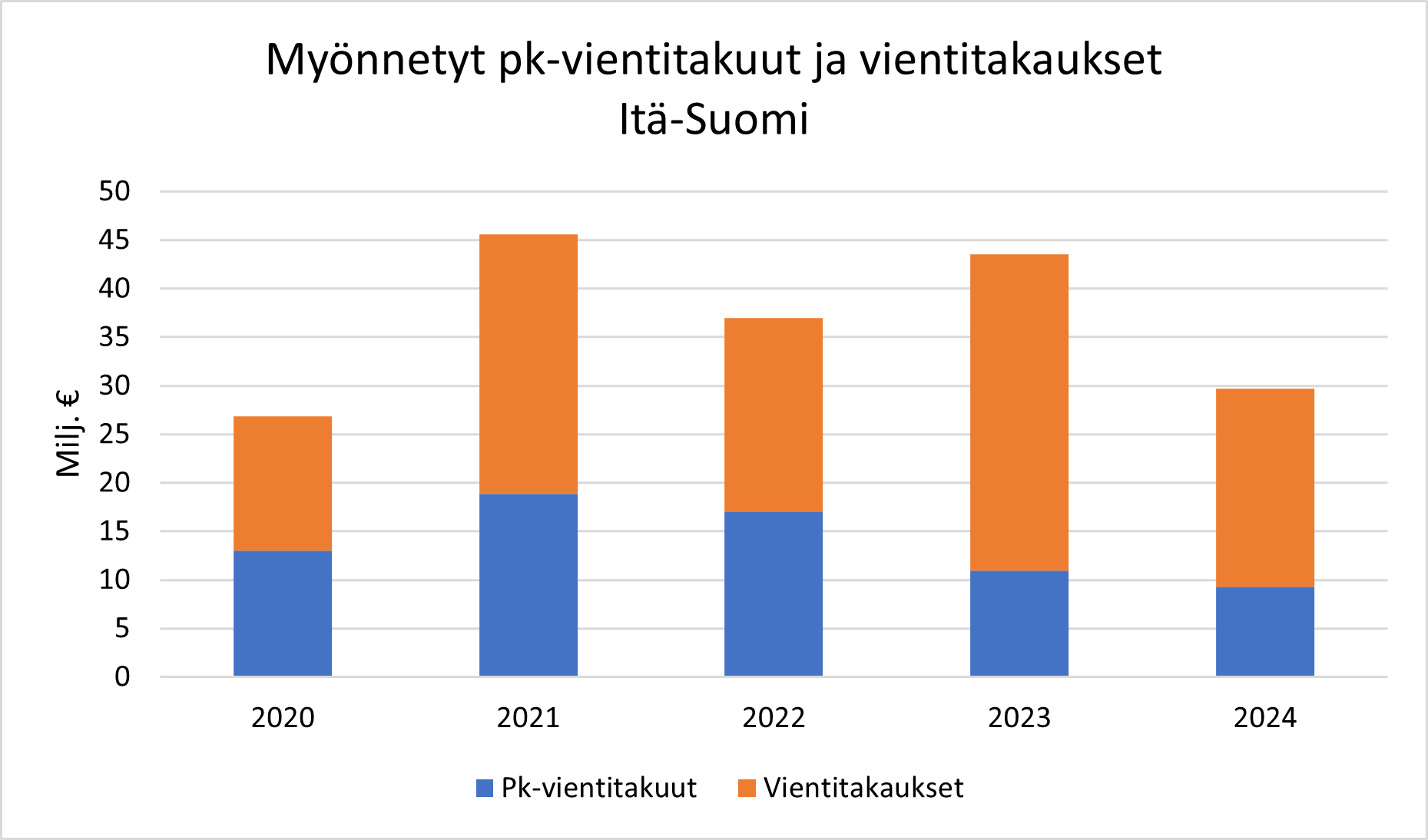 Viime vuonna Itä-Suomen alueella myönnettiin pk- ja midcap-yrityksille vientitakuita ja vientitakauksia yhteensä 30 miljoonan euron (44) arvosta.
