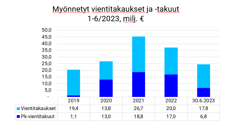 Finnvera toi alkuvuoden aikana uusia tuotteita yritysten rahoittamiseen. Helmikuussa käynnistyi suoran vientiluoton myöntäminen vientikauppoihin, ja kesäkuussa markkinoille saatiin ilmasto- ja ympäristölaina sekä digitalisaatio- ja innovaatiolaina, jotka mahdollistavat vakuudettoman ja edullisen täydentävän rahoituksen saamisen EU-rahoituskriteerit täyttäviin hankkeisiin.