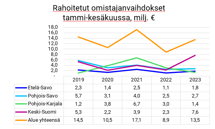 Finnvera myönsi tammi–kesäkuussa 2023 rahoitusta Itä-Suomen alueen neljään maakuntaan yhteensä 94,1 miljoonaa euroa (82,5). Myönnetyn rahoituksen määrä kääntyi kasvuun Pohjois-Savon, Pohjois-Karjalan ja Keski-Suomen maakunnissa. Vain Etelä-Savossa rahoituksen määrä jäi viime vuoden vastaavasta jaksosta. Rahoituksesta entistä suurempi osuus kohdentui teollisuuteen ja investointeihin, mikä kuvastaa Finnveran roolin tärkeyttä alueen teollisten yritysten kasvuhankkeiden rahoituksessa. Myös viennin rahoitus alueella on toipumassa ennätystahtiin.