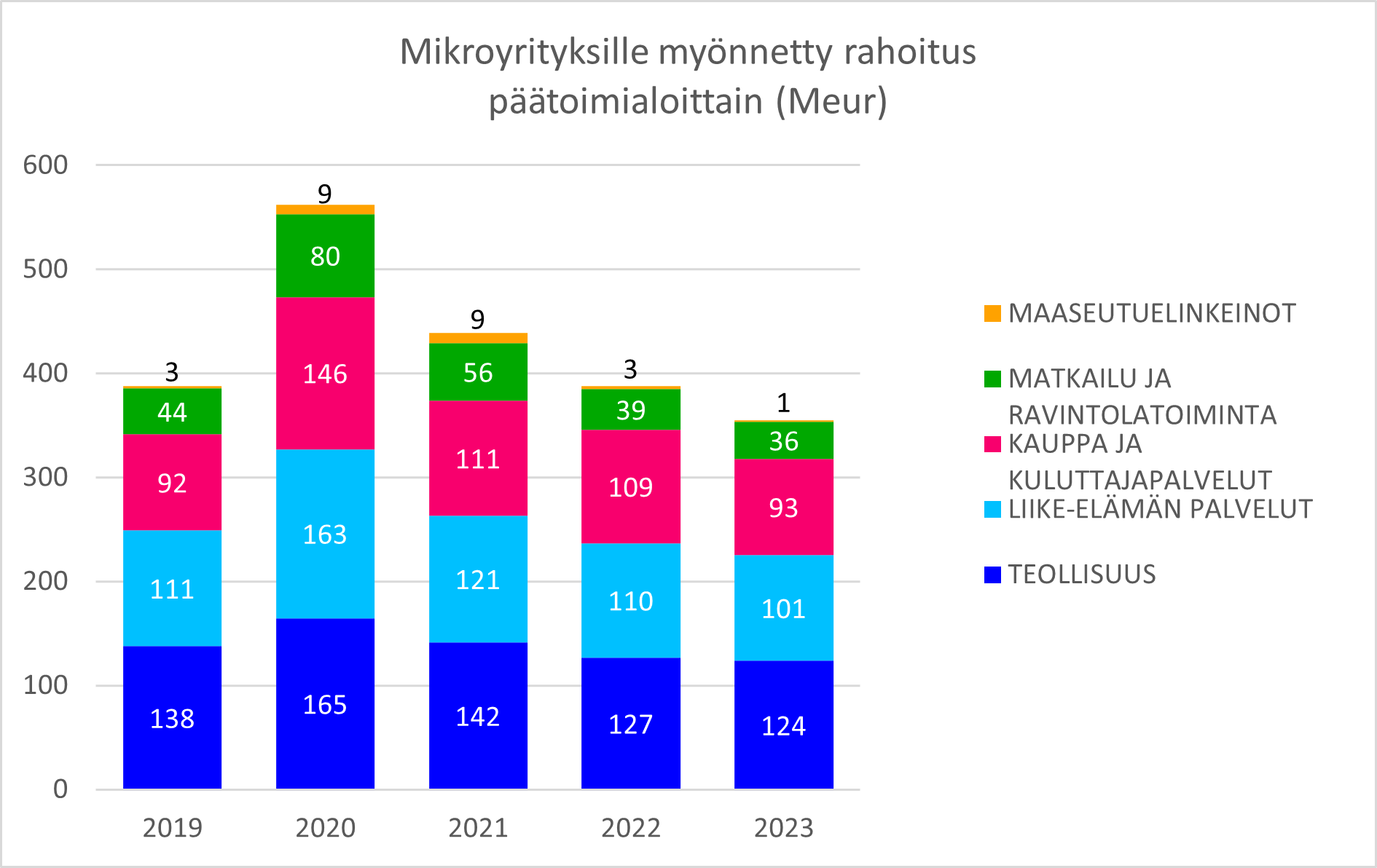 Finnvera myönsi rahoitusta mikroyrityksille vuonna 2023 yhteensä 355 miljoonaa euroa, mikä oli lähes kymmenesosan edellisvuotta vähemmän. Kokonaisuudessaan mikroyrityksistä rahoitusta sai noin 3 500 yritystä. Mikroyrityksellä tarkoitetaan alle 10 henkilöä työllistäviä yrityksiä. Finnveran mikroyrityksille myöntämä rahoitus oli keskimäärin noin 95 000 euroa.