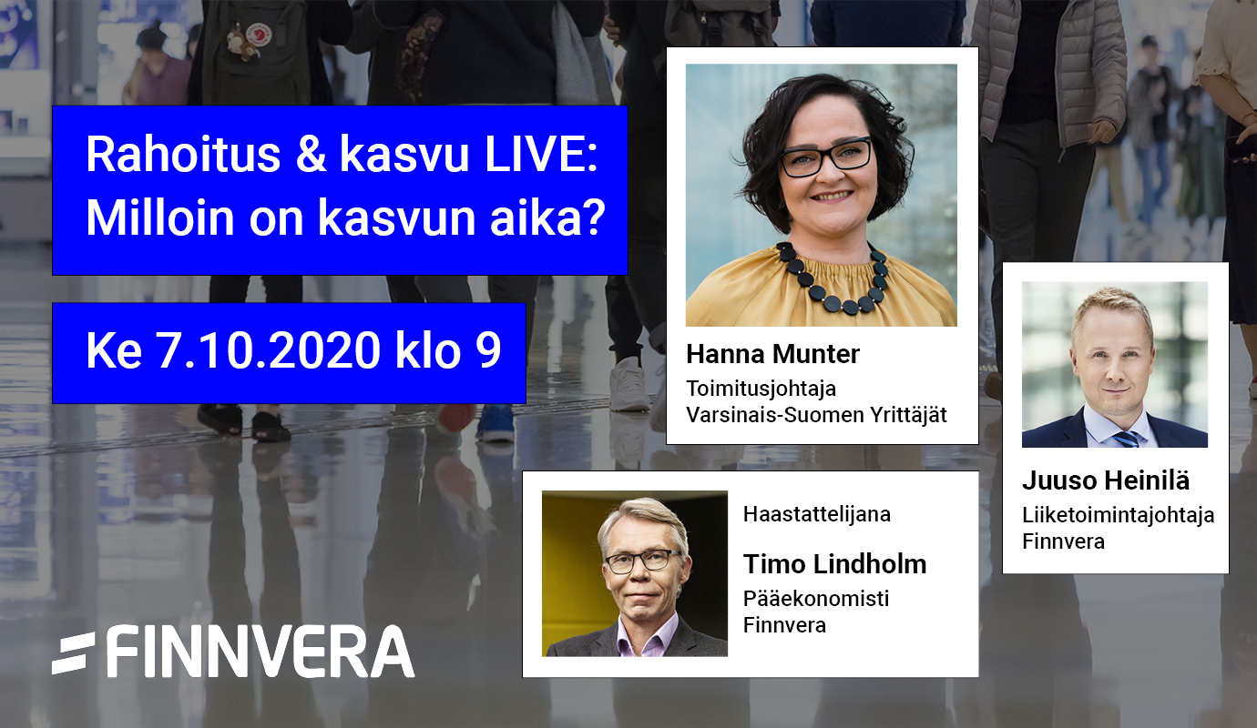 Keskustelun ja Finnveran Rahoitus & kasvu -katsauksen perusteella yritysten näkymät ovat tällä hetkellä melko sumuiset. Huomio on siinä, miten tästä vuodesta selvitään. Toimialojen välillä on kuitenkin suuria eroja. Oleellinen muutos talousnäkymissä viime kevääseen verrattuna on, se että tästä vuodesta selvitään pienemmällä tuotannon ja liikevaihdon laskulla kuin keväällä pelättiin. Samalla kuitenkin talouden toipumisen vauhti 2021 ja 2022 on kuitenkin entistä epävarmempi ja todennäköisesti hitaampi. Finnveran yritysrahoitusmittarin mukaan yritysten tarve käyttöpääomalle ja uusille lyhennysvapaille on jälleen kasvamassa. Kasvuun tarvitaan paitsi rohkeutta yrityksiltä ja rahoittajilta, myös työn tuottavuuden kasvua ja sopeutumista rakenteellisiin uudistuksiin.