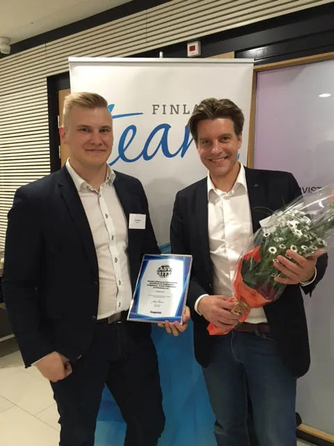 Kuva: Palkinnon vastaanottivat Frameryn toinen perustaja Samu Hällfors ja toimitusjohtaja Ossi Paija.