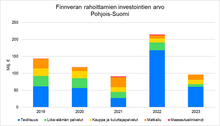 Finnveran rahoitus Pohjois-Suomessa supistui kaikissa maakunnissa eli Lapissa, Kainuussa ja Pohjois-Pohjanmaalla. Korkojen nousu ja epävarmuus tulevien vuosien korkotasosta heijastui erityisesti rahoitettujen investointien ja omistajanvaihdosten määrään. Pohjois-Pohjanmaalla rahoituksen myöntö supistui ja kehitystä selittää edellisvuoden muutamat mittavat teolliset investoinnit. Kainuussa rahoitus supistui 32 prosenttia johtuen teollisuusyritysten vähentyneistä rahoitustarpeista. Lapin matkailussa on käynnistynyt uusi investointiaalto.