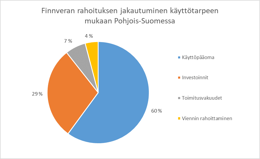 Pohjois-Pohjanmaalla rahoitus kohdistuu tasaisemmin: suurimpina teollisuuden osuus on puolet ja kaupan alan sekä liike-elämän palvelujen osuus yhteensä 44 prosenttia. Matkailun osuus on noin 6 prosenttia rahoituksesta. Maakuntaan on kasvanut iso rakennusalan klusteri, joka nousi erityisesti edellisvuoden rahoituksessa esiin. Oulun seudulla merkittävälle ICT-alalle kohdistui 14 prosenttia Finnveran alkuvuonna myöntämästä rahoituksesta.