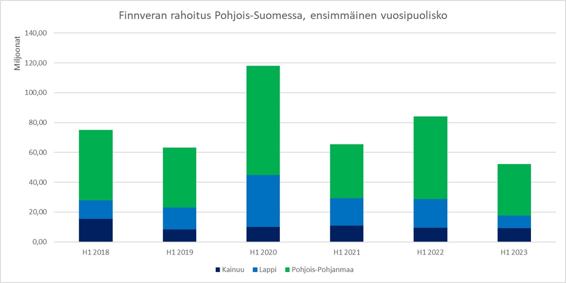 Finnveran myöntämän rahoituksen määrä väheni Pohjois-Suomessa selvästi kaikissa kolmessa maakunnassa eli Lapissa, Kainuussa ja Pohjois-Pohjanmaalla sekä kaikilla päätoimialoilla matkailualaa lukuun ottamatta. Matkailualalla on käynnistymässä uusi investointiaalto. Kainuussa muutokset rahoituksen myönnössä olivat kolmesta maakunnasta pienimpiä ja alueelta löytyy nuoria innovatiivisia yrityksiä, joilla nähdään nyt merkittävää kasvua. Pohjois-Pohjanmaalla on alkuvuoden aikana näkynyt myönteisesti erilaiset vihreän siirtymän investoinnit.