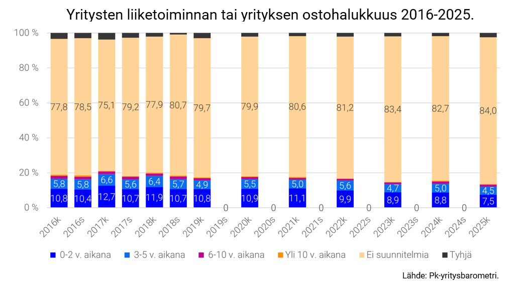 Tulevien viiden vuoden sisällä mahdollisesti myyntiin tulevia pk-yrityksiä on lähes kolme kertaa niin paljon kuin yritysostoa harkitsevia yrityksiä. Määrällinen epäsuhta on kasvanut viime vuosien aikana, ja mitä pidemmälle tulevaisuuteen suunnitellun omistajanvaihdoksen ajankohta menee, sitä suurempi on ero myynti- ja ostohalukkaiden yritysten määrissä. Tämä käy ilmi Pk-yritysbarometreista, joissa kartoitetaan säännöllisesti vastaajien suunnitelmia omistajanvaihdoksiin. Yrittäjistä reilu neljännes on 55–64-vuotiaita eli lähestyy eläkeikää. Huoli, ettei yrityksille löydy tarpeeksi jatkajia, on perusteltu. Samaan aikaan kuitenkin yrityskanta on tasaisessa kasvussa. Finnveran rahoitus omistajanvaihdoksiin näyttää kääntyneen alkuvuonna kasvuun.
