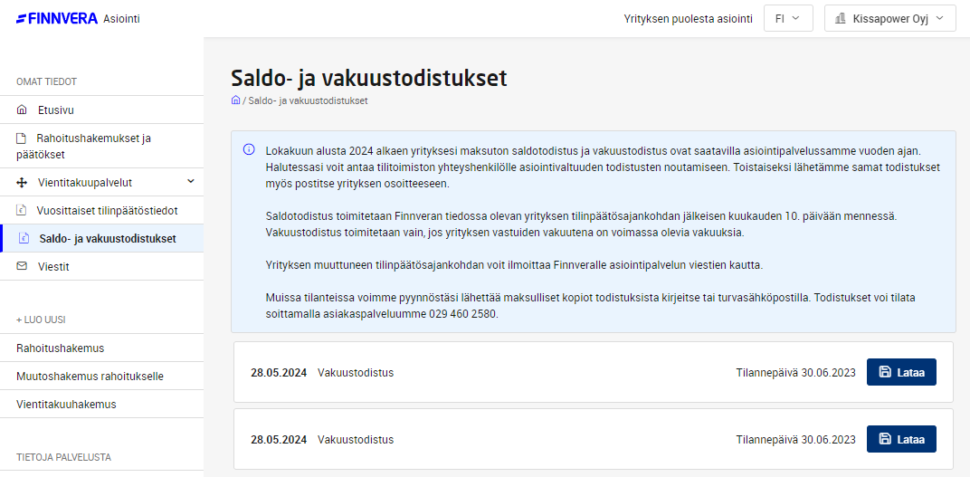 Finnvera toimittaa asiakasyrityksilleen maksuttomasti kerran vuodessa saldotodistuksen yrityksen vastuista. Lisäksi toimitetaan vakuustodistus, jos yrityksellä on voimassa olevia vakuuksia Finnveralle. Yritysasiakkaiden saldo- ja vakuustodistukset 30.9.2024 tilanteesta on välitetty ensimmäistä kertaa myös Finnveran asiointipalveluun.