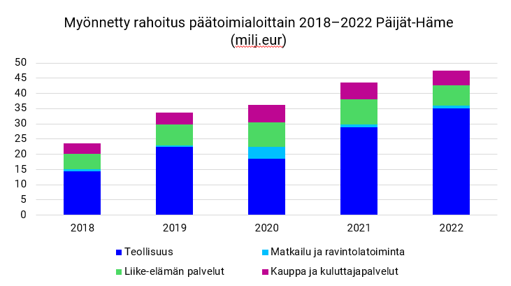 Toimialoista eniten rahoitusta kohdistui Päijät-Hämeen teollisille toimialoille, yhteensä 74 prosenttia Finnveran kokonaisrahoituksesta. Päijät-Hämeen matkailu- ja ravintola-ala selvisi vuoden aikana ilman merkittävää Finnveran lisärahoitusta.