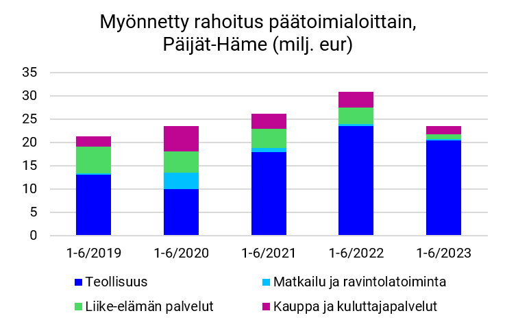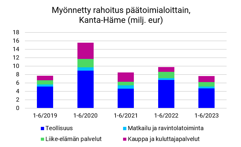 Toimialoista eniten rahoitusta myönnettiin Kanta-Hämeessäkin teollisuuteen. Rahoitus matkailu- ja ravintolatoimintaan sekä kaupan ja kuluttajapalvelujen yrityksille laski koronapandemiaa edeltävälle tasolle.
