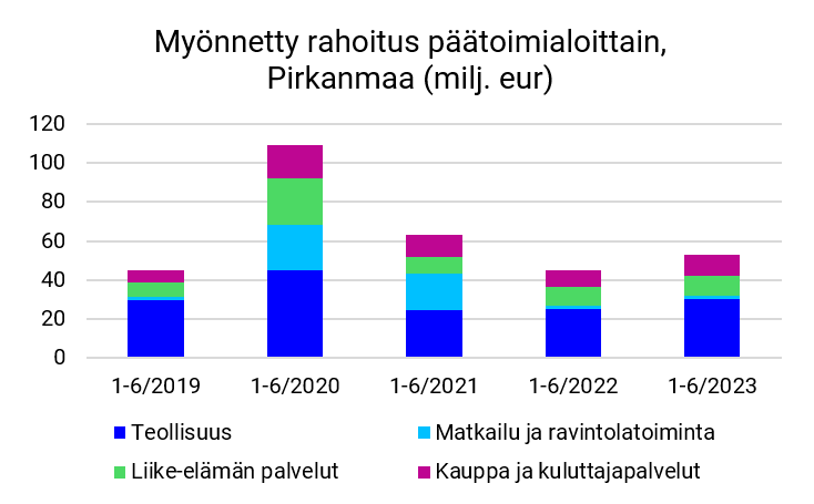 Finnvera myönsi tammi‒kesäkuussa alueen maakunnista Pirkanmaalle rahoitusta yhteensä 53 miljoonaa euroa (45), Päijät-Hämeeseen 24 miljoonaa euroa (31) ja Kanta-Hämeen yrityksille 8 miljoonaa euroa (10).