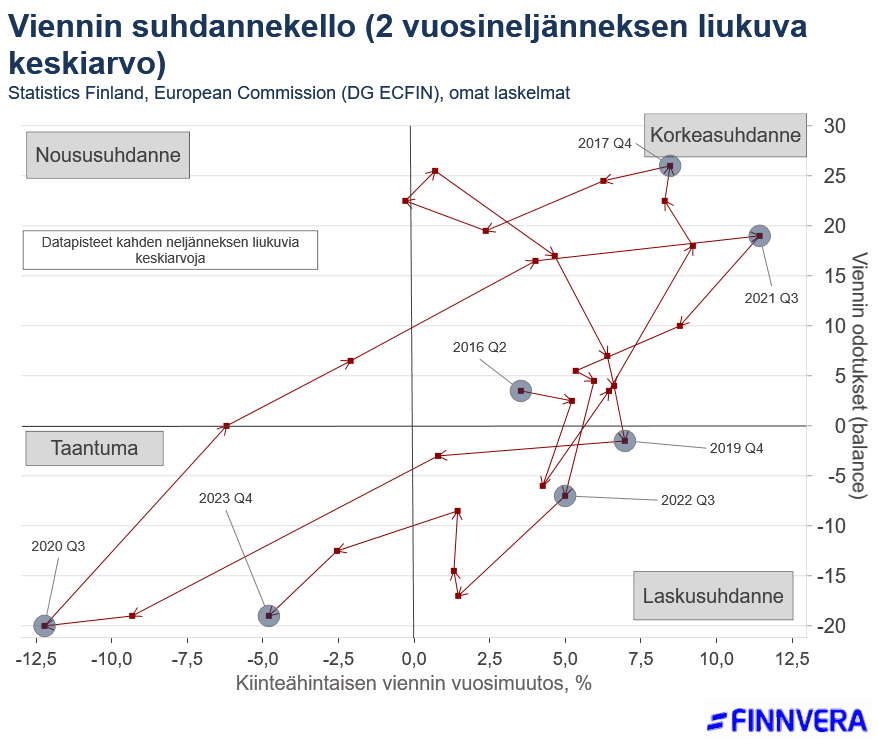 Suhdannekellossa nuolten suunnat kertovat viennin odotusten ja kiinteähintaisen viennin vuosimuutoksen liikkeistä.