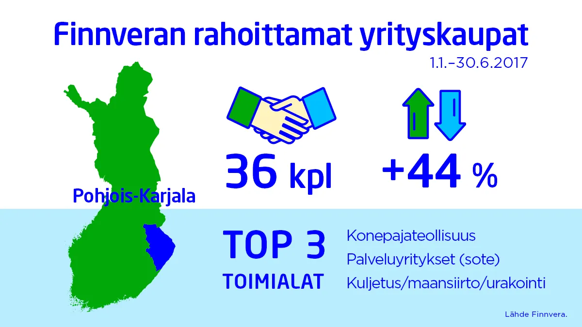 Finnveran tilastojen perusteella Pohjois-Karjalassa yrityskauppoja tehtiin tammi-kesäkuussa 44 prosenttia enemmän kuin vuotta aiemmin. Kasvu on viidenneksi kovinta koko Suomessa. Vain Etelä-Karjala, Kainuu, Lappi ja Kanta-Häme ylsivät kovempiin kasvulukuihin.
