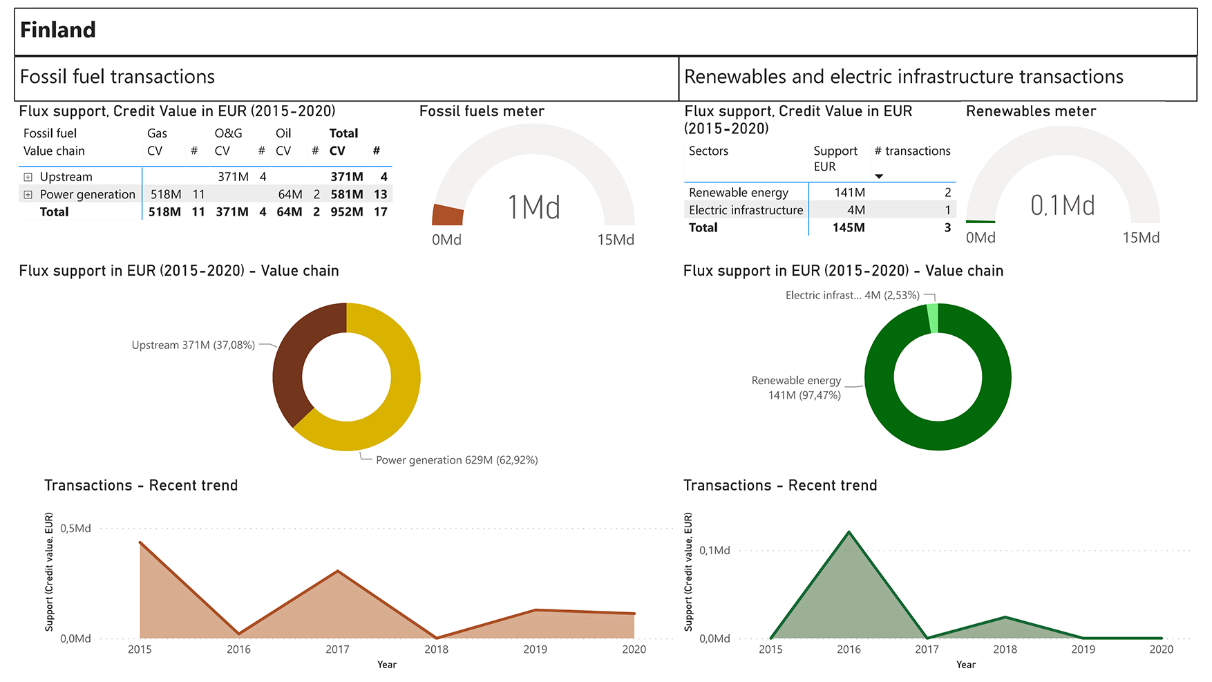 Finnvera tarkasteli vuoden 2021 vuosiraportoinnissaan ensimmäistä kertaa energiantuotantoon liittyvien rahoitusvastuiden jakautumista uusiutuvia ja fossiilisia polttoaineita käyttäviin. Viennin rahoituksen energiantuotantoon ja -jakeluun liittyvät vastuut olivat 758 miljoonaa euroa vuoden 2021 lopussa. Niistä 66 prosenttia liittyi fossiiliseen energiaan, 24 prosenttia uusiutuvaan ja 6 prosenttia turpeeseen. Loput 4 prosenttia olivat luokittelemattomia.